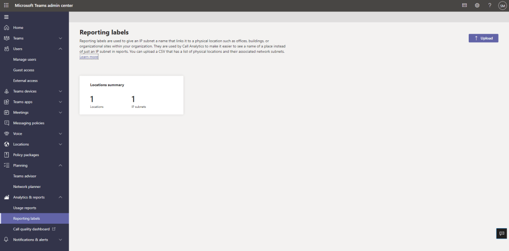 Very similar to the building data file upload for the CQD, reporting labels are a way of associating networks with your physical locations within the Teams Admin Center (TAC). Once uploaded, the location names will be supplied for admins who are viewing call analytics for users within the TAC.