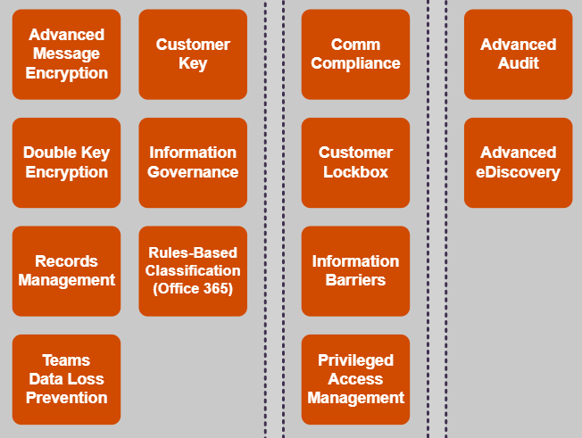 I won’t go into a breakdown of each of these features here but a lot of them are covered in my MS-500 Study Guide. While I recommend checking out each feature individually for your specific licensing requirement, as a general rule, the features shown in Figure 1 require a minimum of the Microsoft 365 E5 Compliance add-on license, or as part of Office 365 E5. Of course, they are also included in the Microsoft 365 E5 SKU which covers all features of the Office 365 E5, Enterprise Mobility & Security E5 and Windows 10 Enterprise. The best visualization for this is probably here where we see a full breakdown of the M365 Enterprise plans and their component parts.