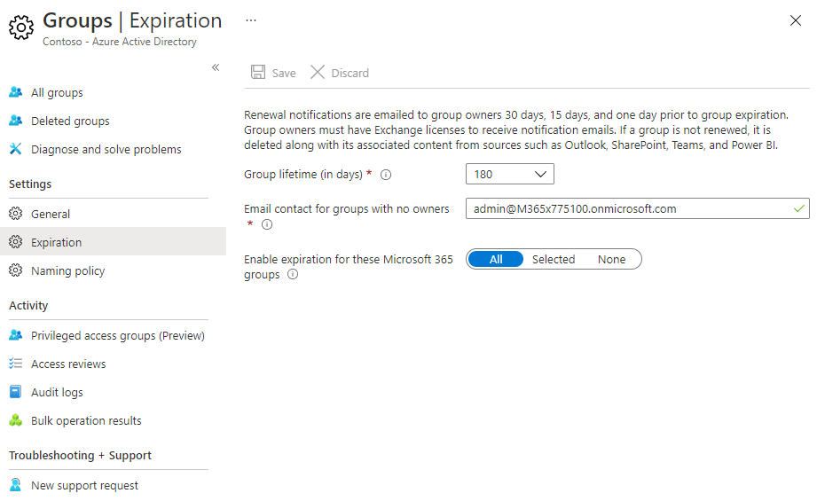 - Enable expiration for these Microsoft 365 Groups – The groups in scope for expiration, this can be all groups, no groups or a selection of groups