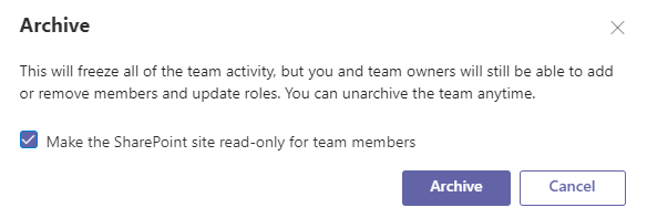 Archiving a Team is done from the Teams Admin Center (TAC) under the Teams -> Manage Teams section. Select the Team to archive and from the top menu, select the Archive option. you can also choose to make the backend SharePoint site read only at this point (Figure 4) to prevent new data or modifications.