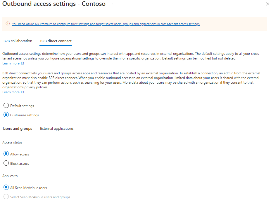 If you choose to leave the default setting as blocked for Direct Connect (and I recommend you do) the organizational settings page allows you to specify specific organizations to form a relationship with by specifying either their Tenant ID or Domain Name. Once the organization is added, you can modify the inbound and outbound access settings to allow Direct Connect and override defaults (Figure 2). With Azure AD Premium P1 licensing you can also limit these relationships to specific user groups or applications in your tenant.