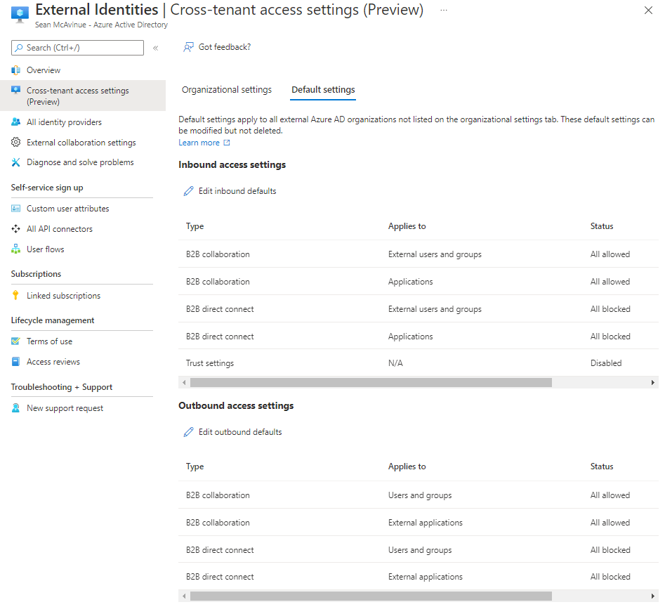 Direct Connect is off by default but can be modified from the External Identities -> Cross-tenant access settings page in the Azure AD Admin Portal. From here, you can view and modify the default settings for Direct Connect (Figure 1). These settings are split into inbound and outbound policies. You can also add additional control to the standard B2B collaboration functionality by limiting which tenants can send or receive Guest User invites with your users.