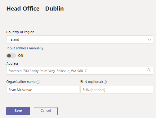 Emergency addresses are passed by phone systems to emergency responders (depending on country regulations) to provide a location for the caller. Emergency Addresses are found under Locations -> Emergency Addresses. From here, select Add to add your first emergency address. Each emergency address requires a name, country / region, address, organization name and optionally an Emergency Location Identification Number (ELIN) for the location as shown in Figure 2. The address can be looked up on Bing Maps or entered manually if not found.