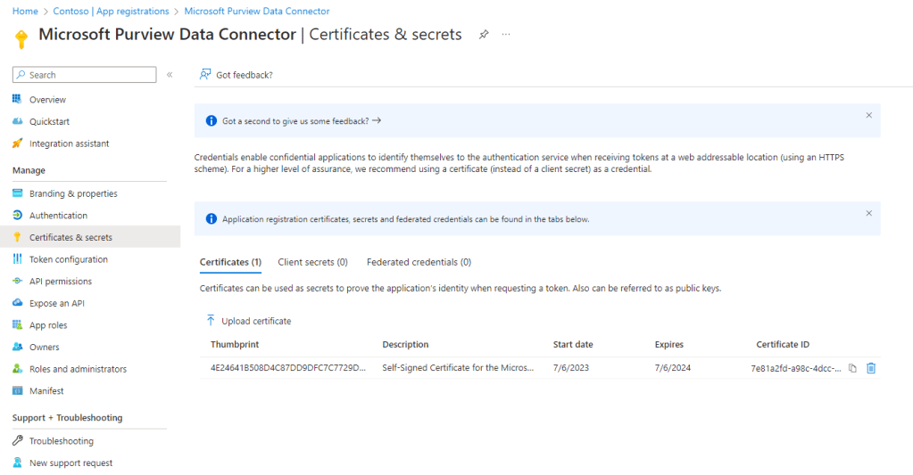Once the cert is created, upload it to the app registration under the Certificates & Secrets page as shown in Figure 3.