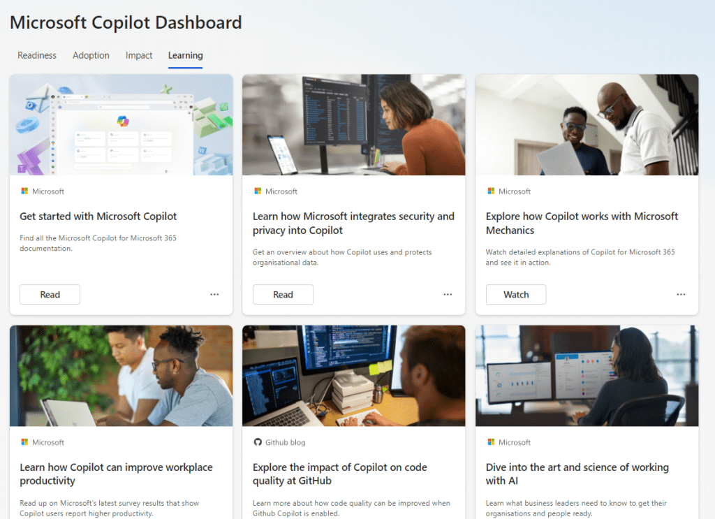 Finally the Learning section (Figure 4) provides tonnes of reading materials and videos to help people understand and explore Copilot for Microsoft 365. Much of this content is available in https://adoption.microsoft.com so I recommend checking that site out to learn more about Copilot and Adoption.