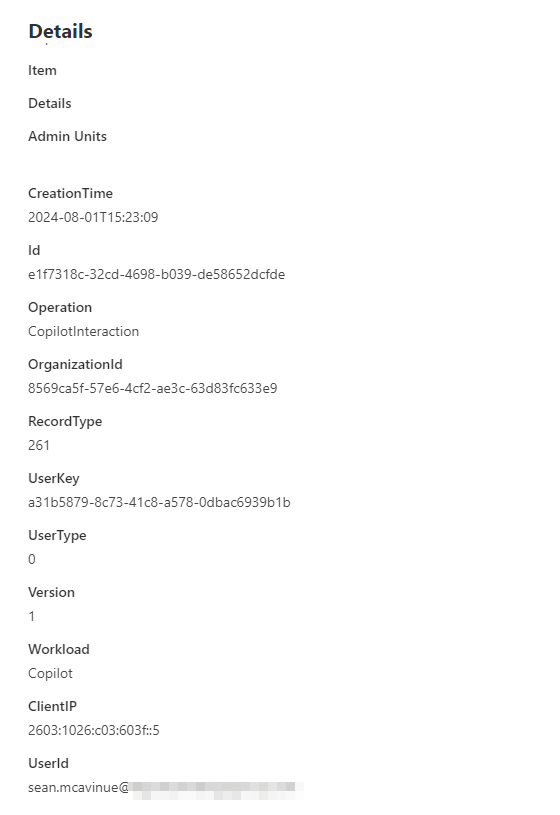A Copilot interaction consists of a few pieces of data: TMetadata such as the users name, app used and timestamp, the query sent, and the data retreived. It’s important to note that the audit log in Microsoft 365 does not contain the query or the data retreived. This content is stored for various purposed but is actually stored within the users own mailbox and accessible only via a Content Search or eDiscovery.