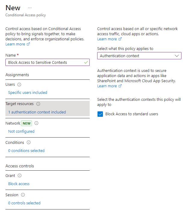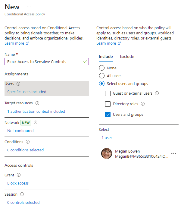 Finally, we need a Conditional Access policy to bring everything together. From the Microsoft Entra admin center, create a new Conditional Access policy with the settings required. In the example shown in Figure 6 and Figure 7, I create a policy targeting Megan Bowen where the target resources is the Authentication Context I set up earlier. The action on the policy is “Block”.