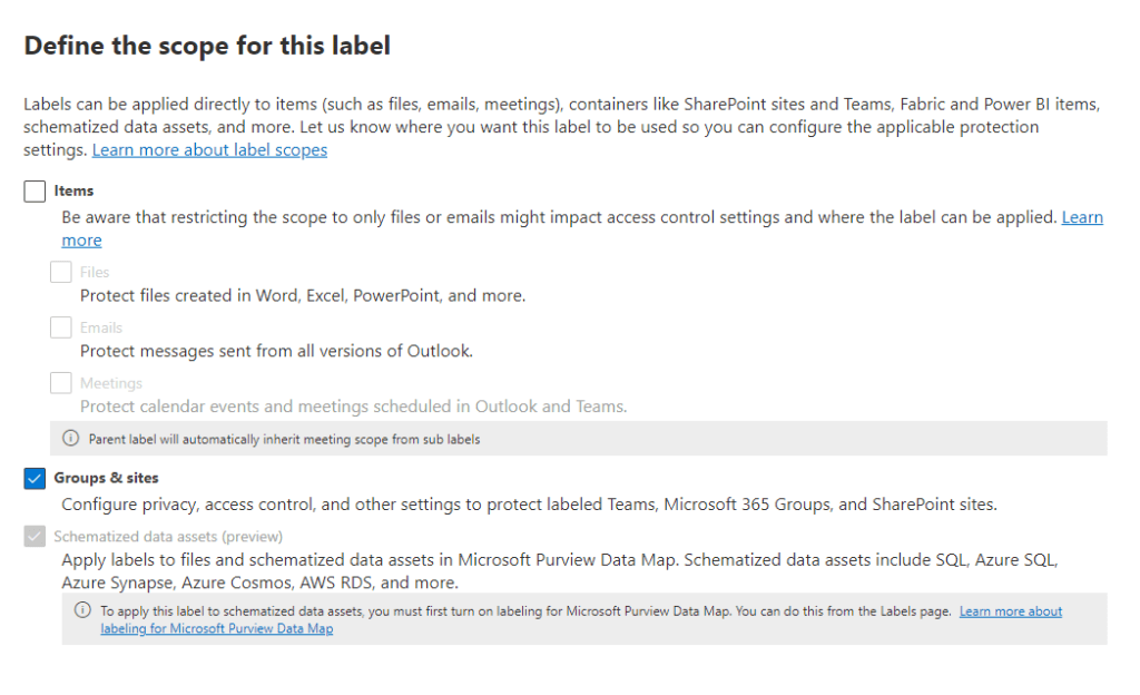If you’ve carried out the required prerequisites, you should now be able to select “Groups & sites” from the label scope page (Figure 3). Select this and click next.