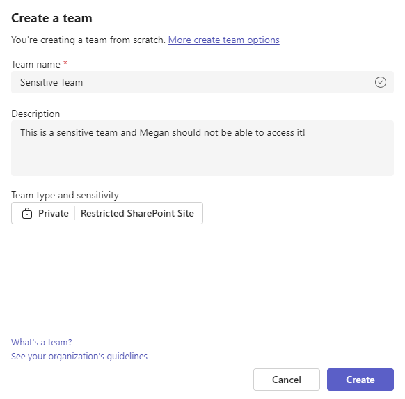 To test our configuration, we create a test site that has the sensitivity label we created previously assigned. For this example, let’s create a Team to see what the impact is on the Teams client. From the Teams client or admin center, create a new Team and make sure to assign the label you created earlier as shown in Figure 8. If the label option doesn’t show up, you might need to wait a while for everything to replicate.