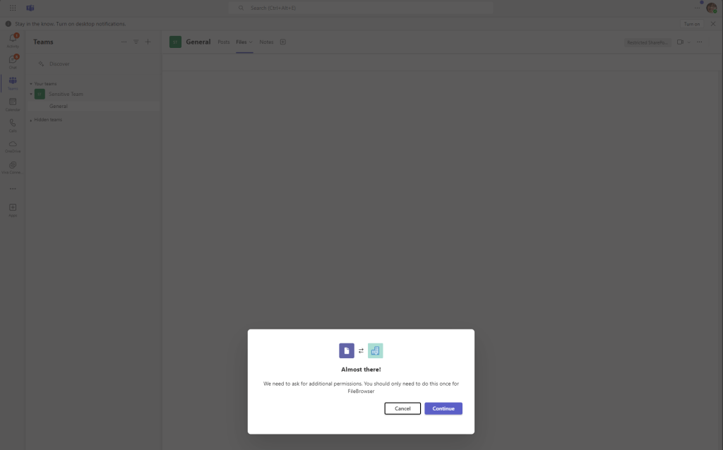 In Figure 11 however, I’ve logged in as Megan, who is targeted by the Conditional Access policy. She can see the Team, but when she attempts to access the files tab she get’s a pop up message.