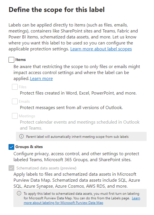 If the above steps completed successfully, you will no be able to select the “Groups and sites” option in the label scope when creating a new label (shown in Figure 1).