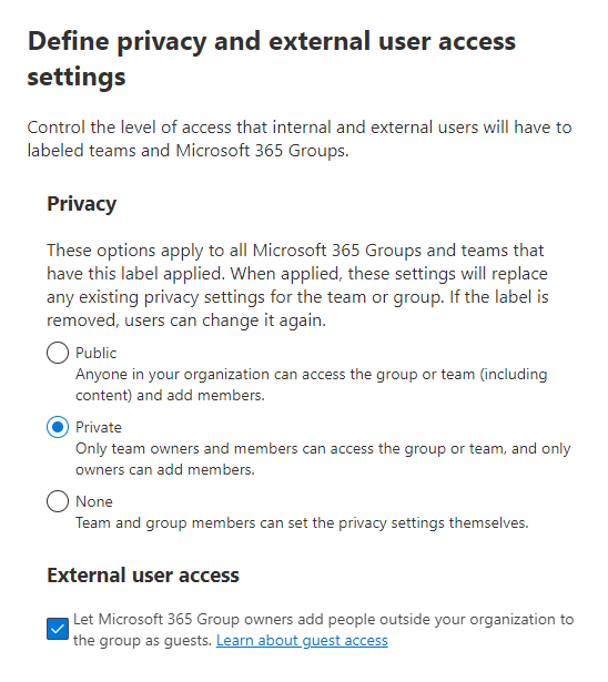 The other option available “External user access” specifies if Guests can be added to the Group. This is a very useful setting when provisioning sensitive Groups where you don’t want external access. For these cases, this would be combined with the external sharing controls I cover next.
