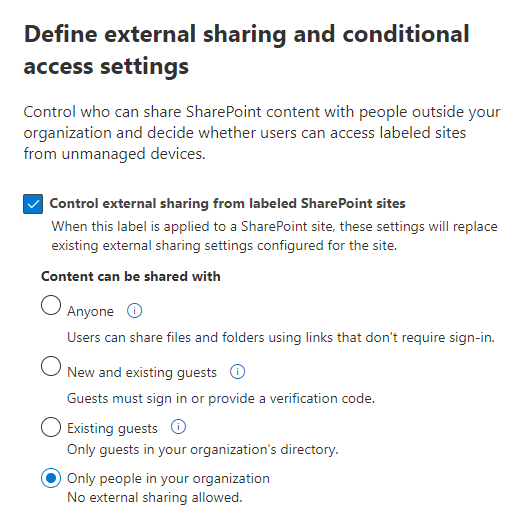 These settings might look familier as they are the same available sharing settings as you have in the SharePoint Online Admin Center for the entire tenant. For a very sensitive site, you will most likely be setting this to “only people in your organization” and combining it with the Guest access settings I mentioned previously.