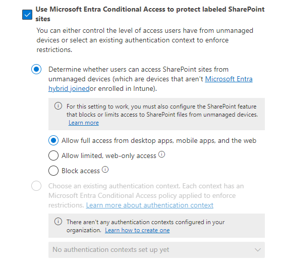 From here we can specify the Conditional Acess app control settings to limit access from unmanaged devices (devices that aren’t hybrid joined or Intune enrolled. We also have the option to set authentication contexts on our Groups and sites which I discussed in this recent article on using authentication contexts to block sensitive sites.