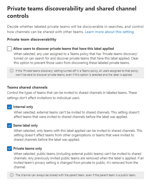 - Same label only – This prevents channels from being shared with Teams that don’t have the same label applied. This is useful if you have labels to define Teams that belong to particular topics.