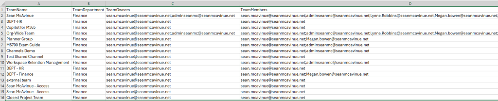 Figure 1 below shows the first half of the report outputs containing the list of Teams, the department of the first owner (I set my department to “Finance” for this example) and the Team members and owners.
