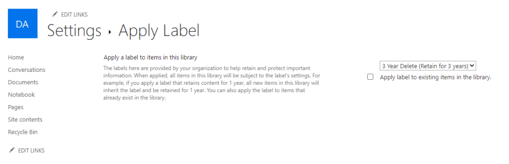 Running through the process takes minutes to update multiple libraries in multiple sites. When checking the site afterwards, we can confirm that the label is applied to the libraries as expected (Figure 3).