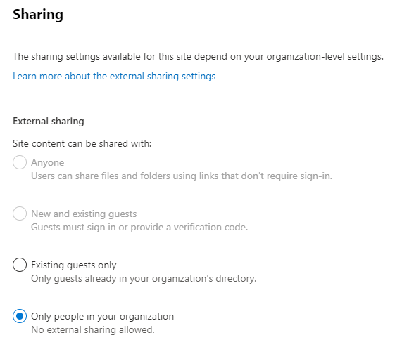 You can control external sharing though, and limit risk on particular sites and Teams by configuring the site-specific sharing settings. For example, you may have a Finance Team where the contents should never be shared externally. This can be limited on the site level by opening the sharing settings of the site from the SharePoint admin center and setting the sharing policy to “Only people in your organization” as shown in Figure 2.