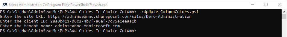 Ok, maybe not the most straightforward script but it gets the job done! The script runs pretty simply as shown in Figure 5. If you don’t have a client ID or tenant name, check out my previous article on Preparing for upcoming PnP PowerShell changes!